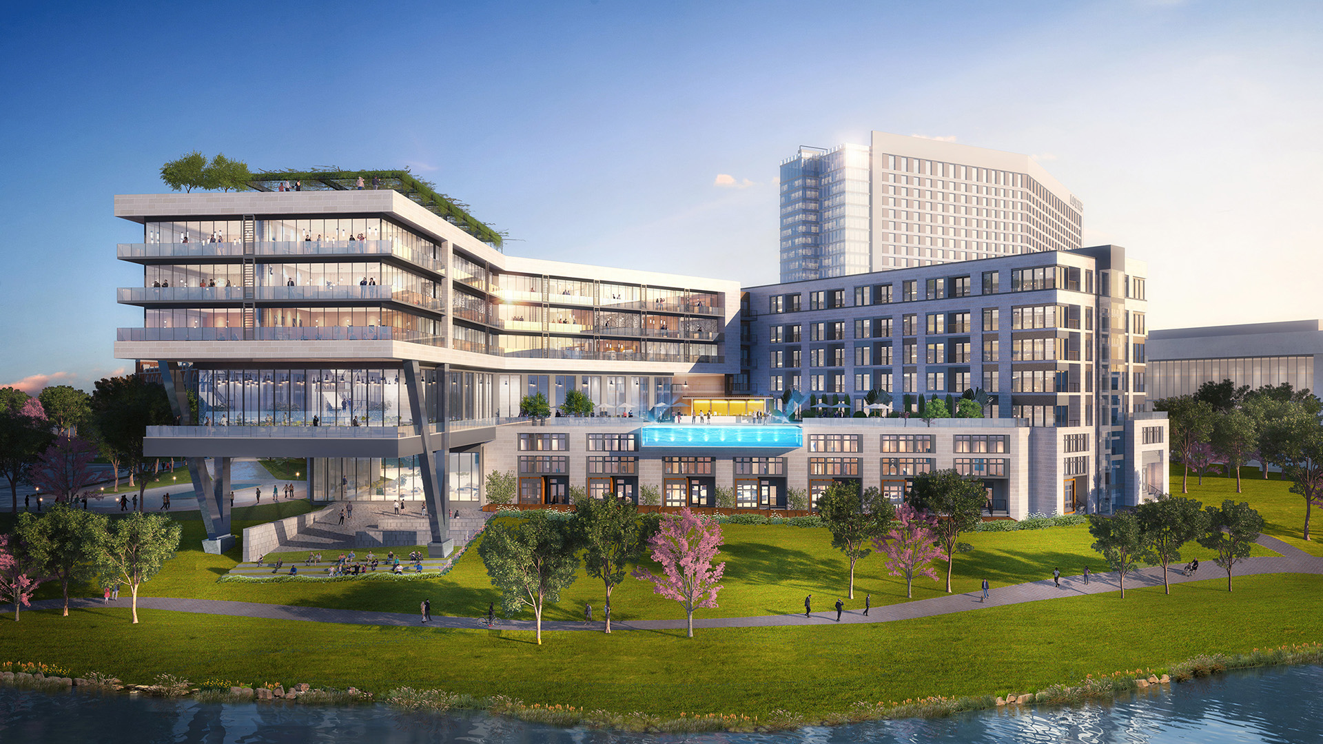 - An expansive outdoor amenity deck with green spaces