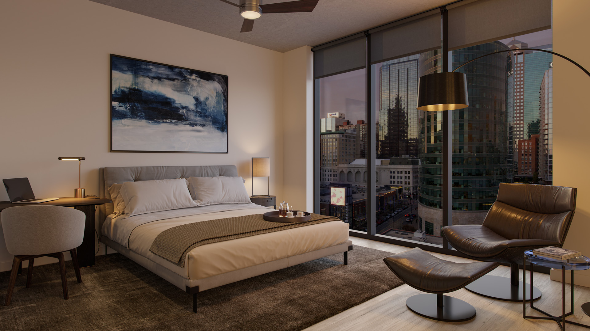 - Units offer floor-to-ceiling windows with inspiring views of the city, gourmet kitchens, luxury Quartz countertops, private balconies and high-end finishes