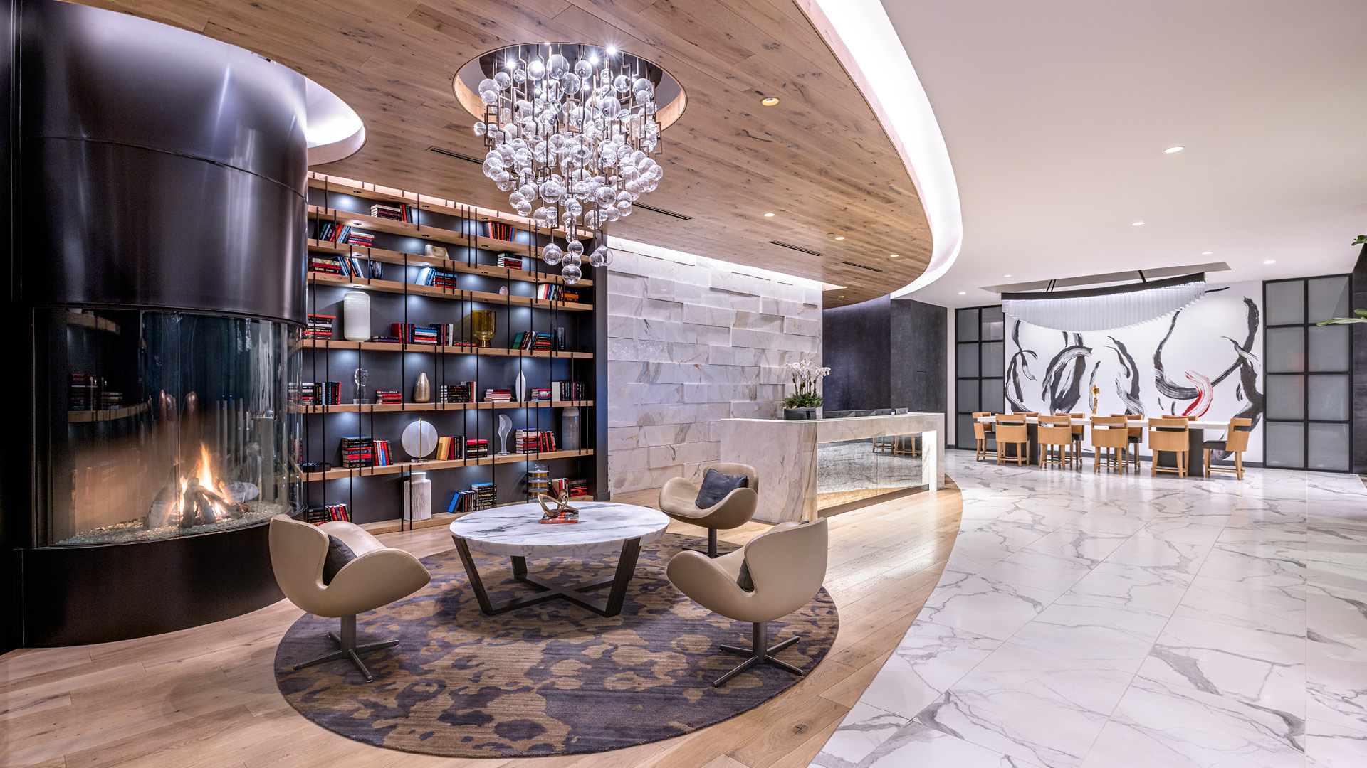 • Club Room featuring an indoor-outdoor bar and fireplace
